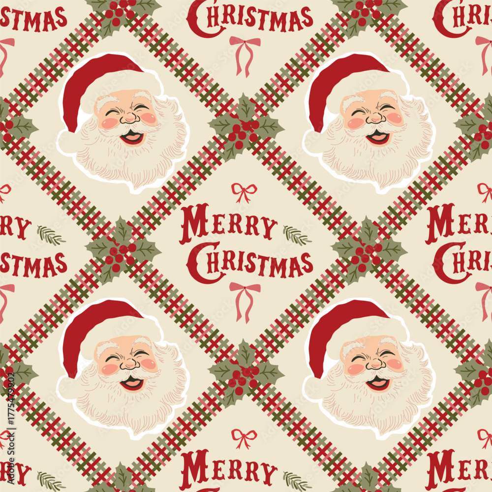 Fototapeta na wymiar - Vintage Santa, Christmas plaid, letterring seamless pattern. Cozy cottagecore winter holidays wallpaper, patchwork repeat background. Vector New Year damask print, mosaic textile design, gift paper..
