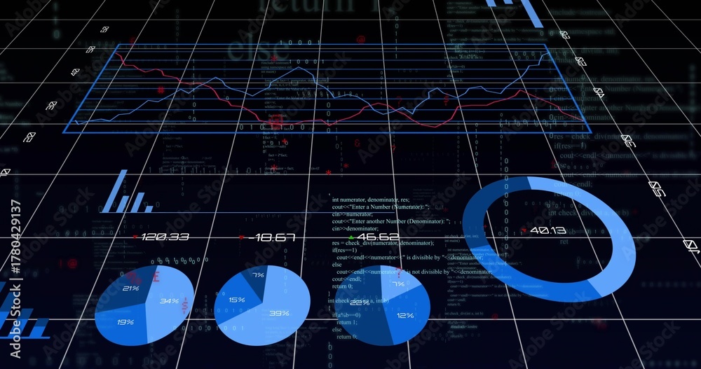 Fototapeta na wymiar - Displaying data visualizations on analytics dashboard, with line graph pie charts donut chart.