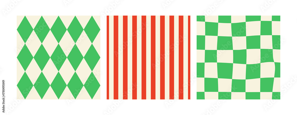 Fototapeta na wymiar - Set of abstract geometric holiday seamless patterns. Christmas vector flat backgrounds with stripes, checks and rhombuses. Festive design for wrapping paper, textiles and greeting cards.