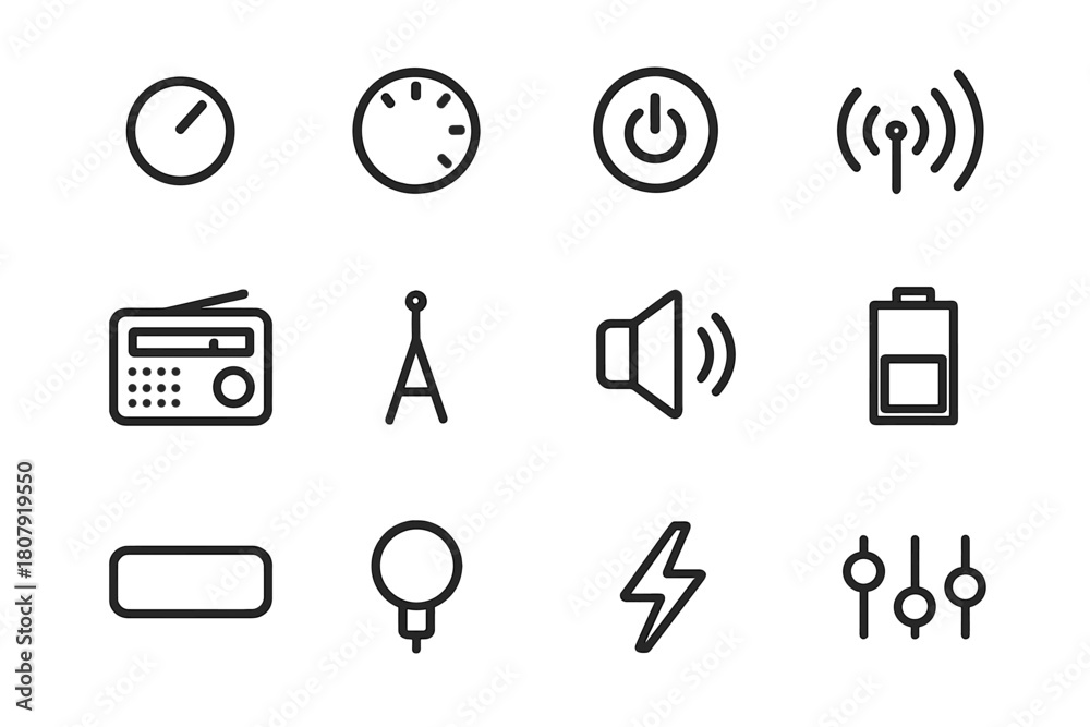 Fototapeta na wymiar - Radio Control Icons. Radio control. Line icon set of radio control: tuning knob, volume dial, power button, signal waves, AM/FM radio, antenna, speaker,.