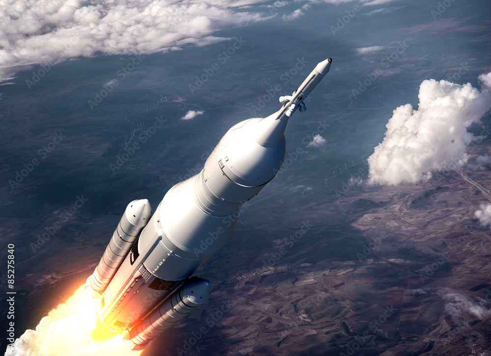 Fototapeta na wymiar - Space Launch System Flying Over The Clouds.