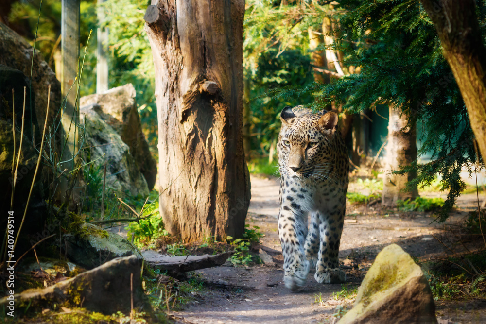 Fototapeta na wymiar - Persian leopard (Panthera pardus saxicolor) walking under trees..