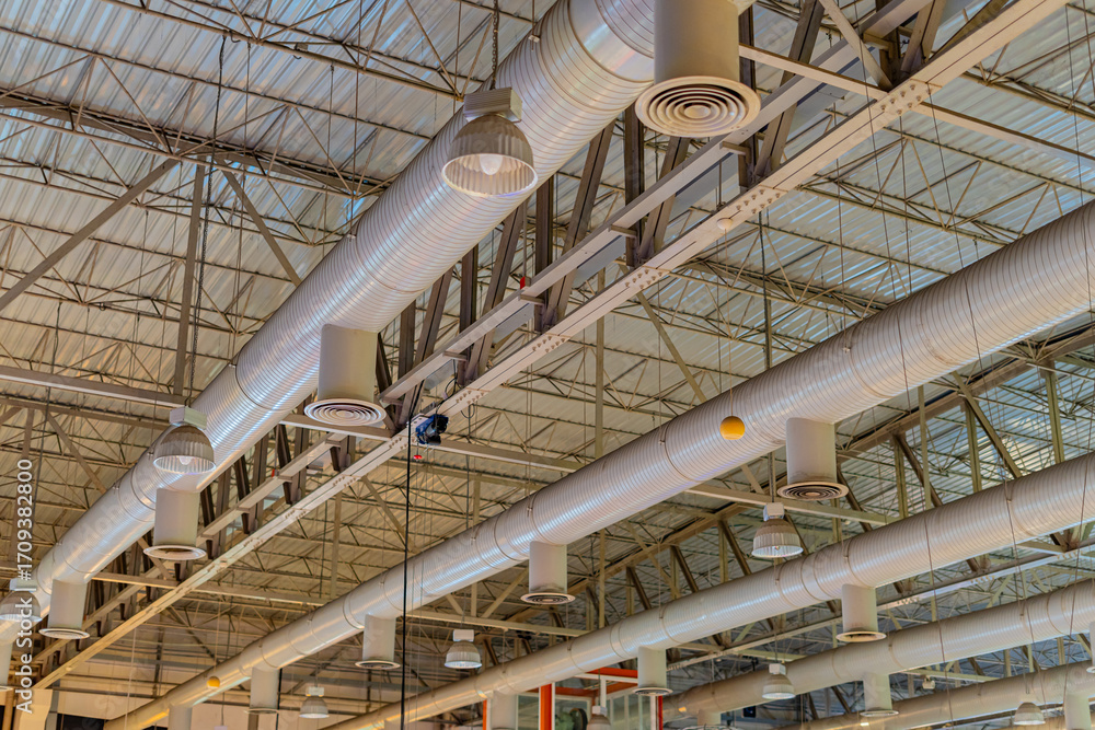 Fototapeta na wymiar - Air conditioning ducts on the ceiling of a large building hall.
