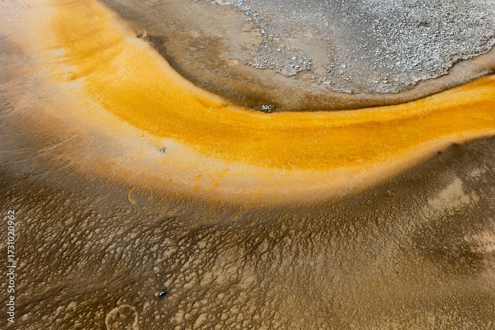 Fototapeta na wymiar - Stunning aerial view of vibrant yellow river winding through textured earth, creating a natural abstract landscape with unique geological formations.