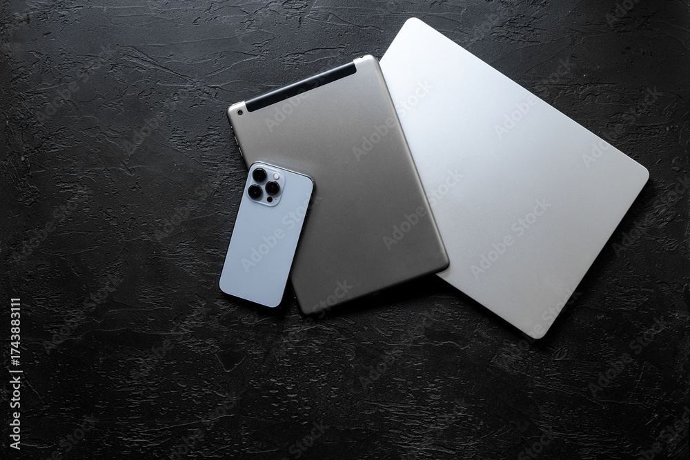 Fototapeta na wymiar - Silver laptop with tablet and mobile phone - high tech gadgets on black stone background, top view.