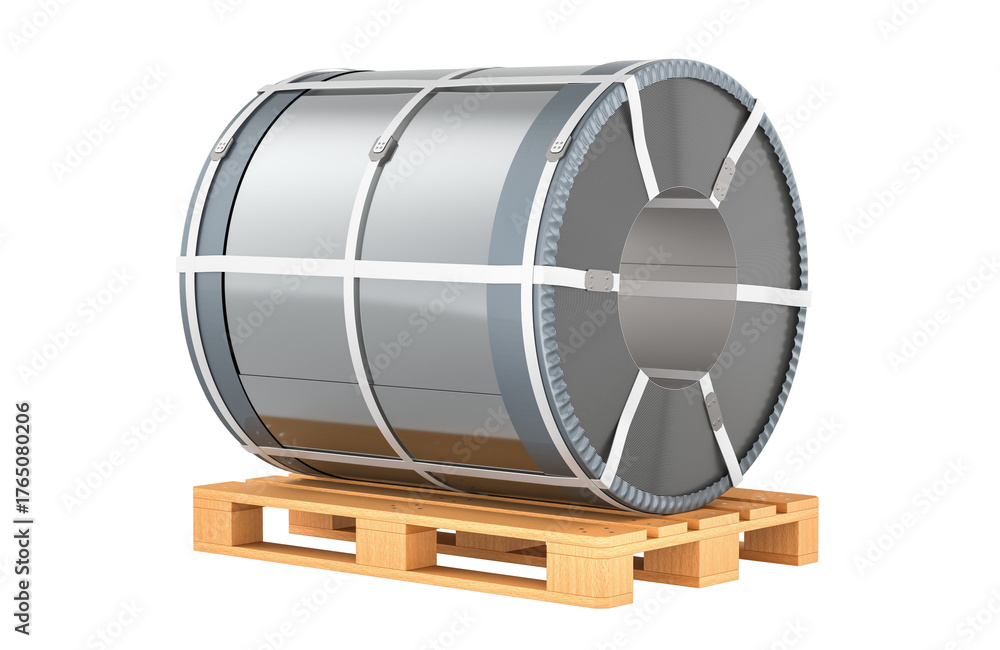 Fototapeta na wymiar - Roll of sheet steel on wooden pallet, 3D rendering.
