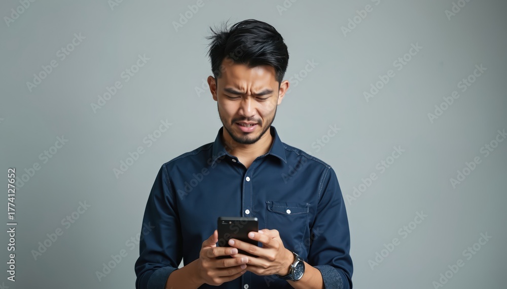 Fototapeta na wymiar - Young Asian man looks irritated by text message on smartphone. Guy wears navy shirt, holding mobile phone, showing upset facial expression and negative emotion..
