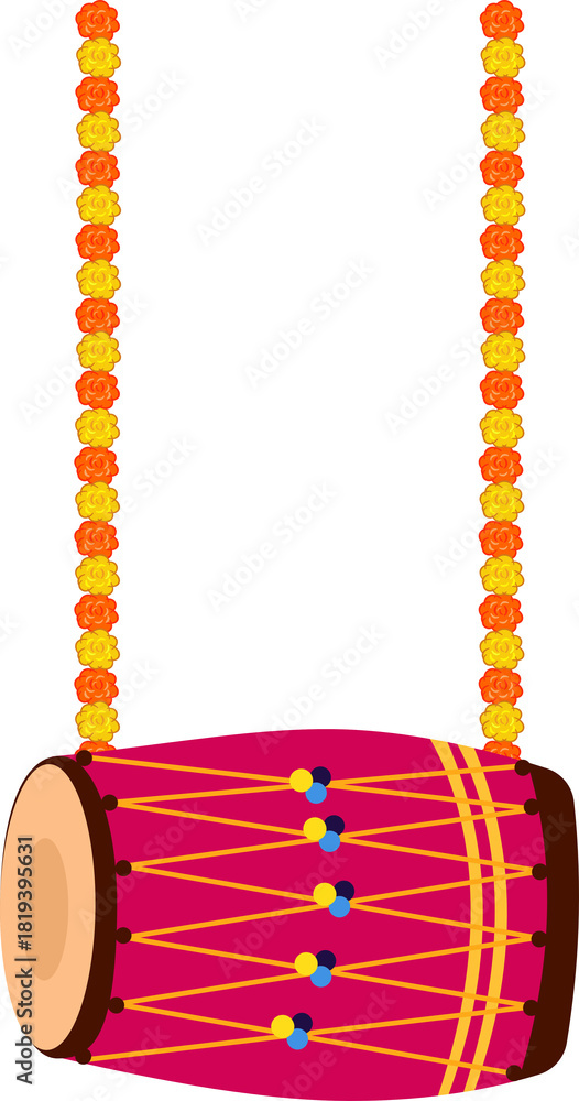 Fototapeta na wymiar - decorative dholak with marigold garlands for wedding function backdrop .