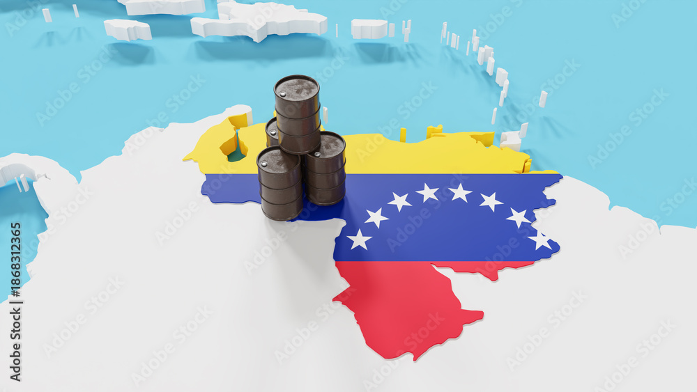 Fototapeta na wymiar - 3d map of Venezuela covered with its flag and oil barrels.