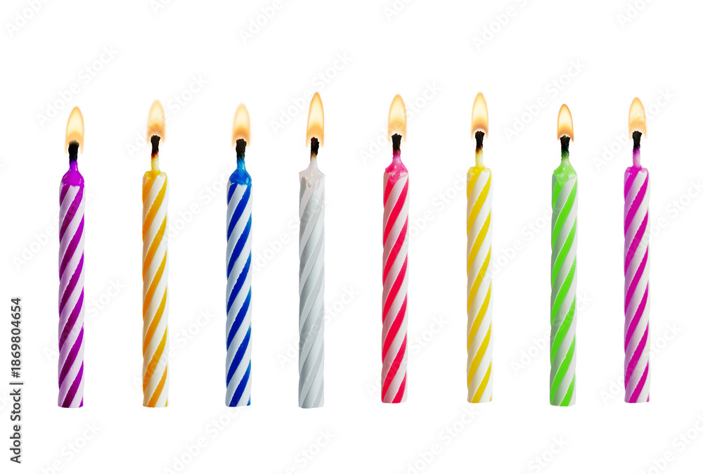 Fototapeta na wymiar - Set of colorful birthday candles with flames isolated on transparent background. Multicolored candles for design birthday themes..