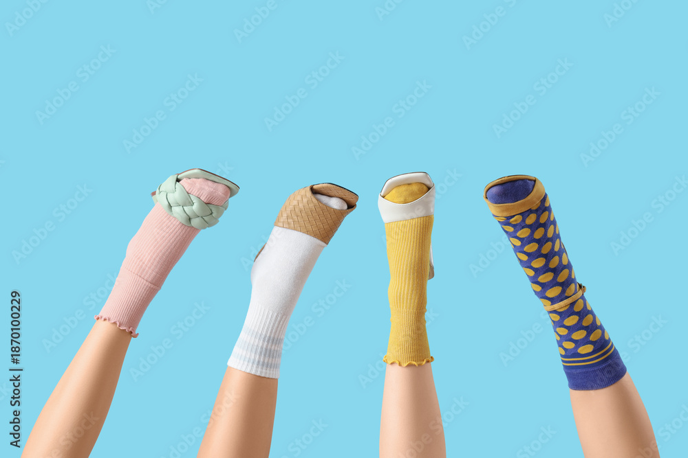 Fototapeta na wymiar - Female legs in stylish shoes with socks on blue background.