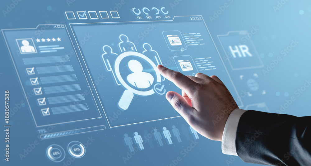 Fototapeta na wymiar - Digital HR interface showing candidate selection process with futuristic holographic display on blue background, illustrating recruitment concept..