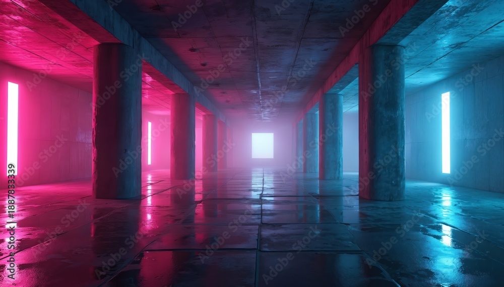 Fototapeta na wymiar - Futuristic concrete corridor with glowing neon lights in pink and blue hues. Reflections on wet floor add depth to this modern, atmospheric space. A bright light shines at the end..