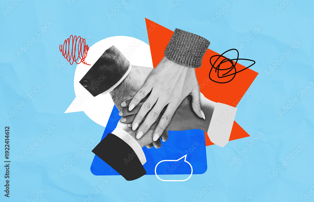 Fototapeta na wymiar - Creative concept of teamwork and collaboration with diverse hands stacked together on colorful geometric background with speech bubbles and scribbles..