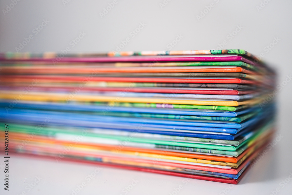 Fototapeta na wymiar - pile of colorful children books on white desk with shallow depth of field.