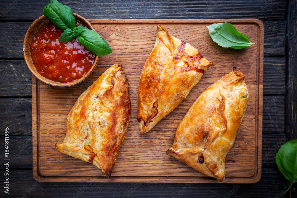 Fototapeta na wymiar - Asian food Samsa or samosas with chicken fillet on cutting board. Top view.