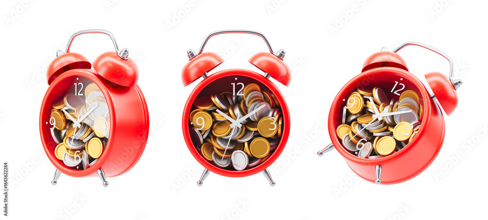Fototapeta na wymiar - Red alarm clocks stuffed with shiny gold and silver coins, isolated on white background, representing time is money concept in 3D Rendering.