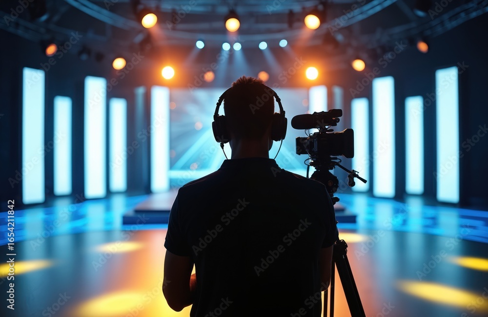 Fototapeta na wymiar - Pro cameraman with headphones films live event on stage with vibrant lights. Videographer captures broadcast production, focusing on action in television studio. Media industry work..