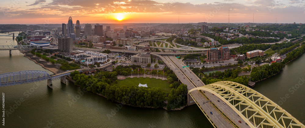 Fototapeta na wymiar - Night urban landscape of downtown district of Cincinnati city in Ohio, USA. Skyline with driving cars on bridge and brightly illuminated high skyscraper buildings in modern American megapolis.