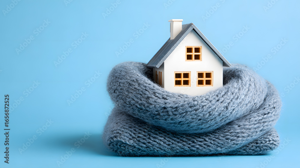 Fototapeta na wymiar - Home in a knitted scarf on a blue background, Concept of the heating system in a winterized house. keeping warm in the house.