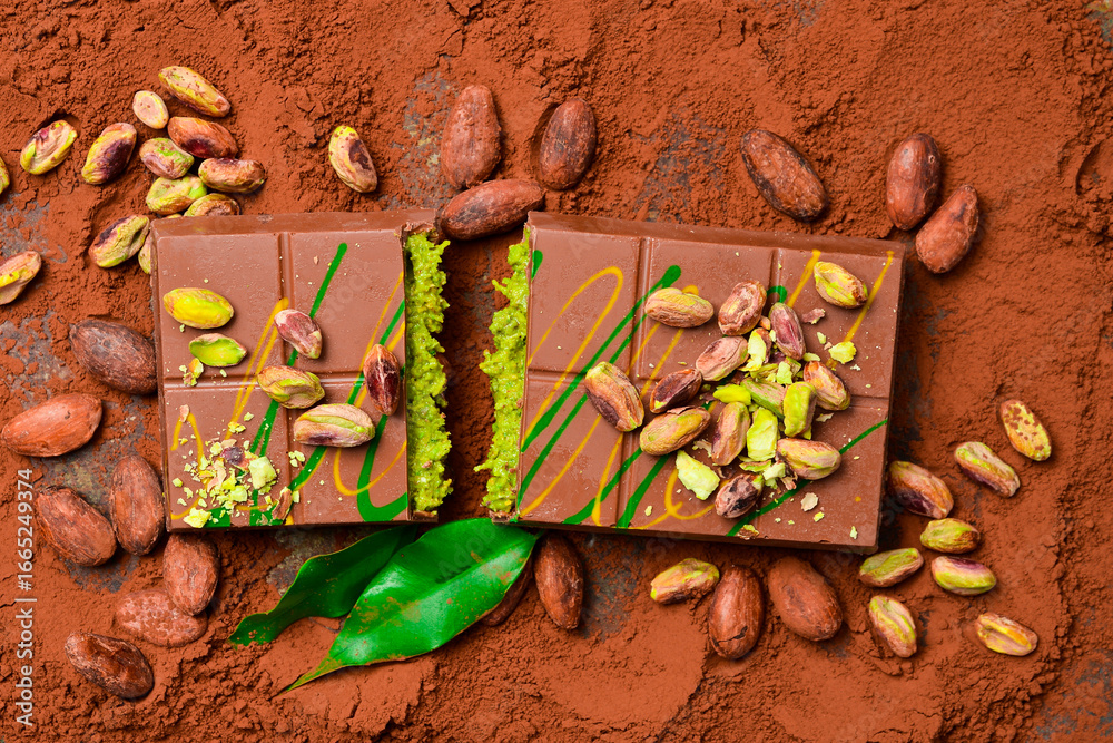 Fototapeta na wymiar - Pieces of Dubai chocolate bars with pistachios, cocoa beans and knafeh on the table. Cocoa powder..
