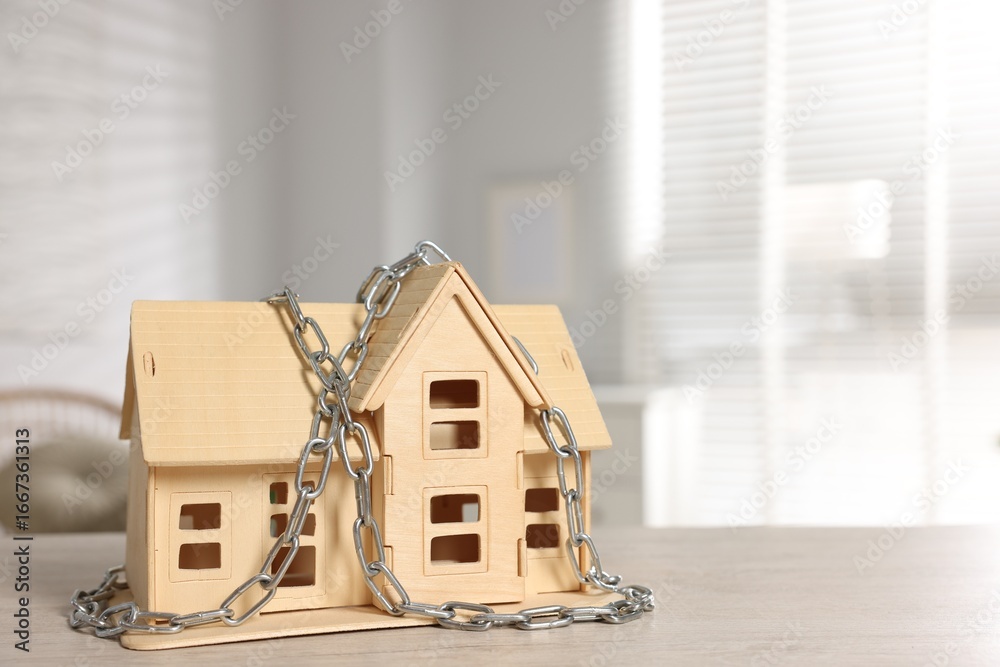 Fototapeta na wymiar - Home security. House model with chain on wooden table indoors, space for text.