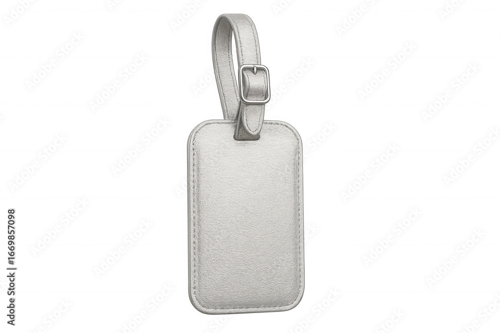 Fototapeta na wymiar - Silver leather luggage tag lying flat, blank surface waiting for custom text, transparent backdrop highlighting clean design.