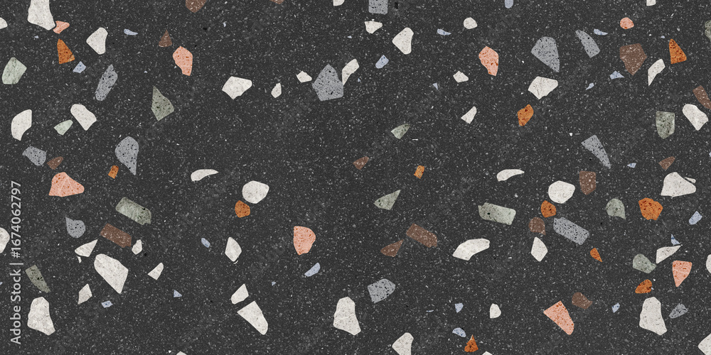 Fototapeta na wymiar - Black terrazo texture. Colorful mosaic stones, granite background.