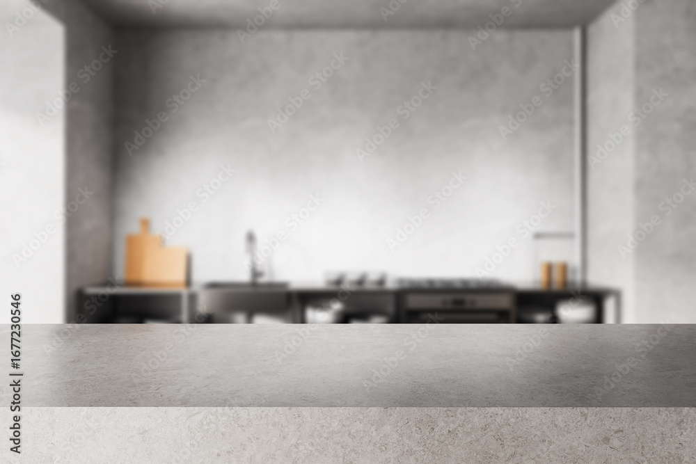 Fototapeta na wymiar - Minimalist concrete kitchen interior with blurred modern appliances and countertop in foreground, stylish home design concept scene. 3D Rendering.