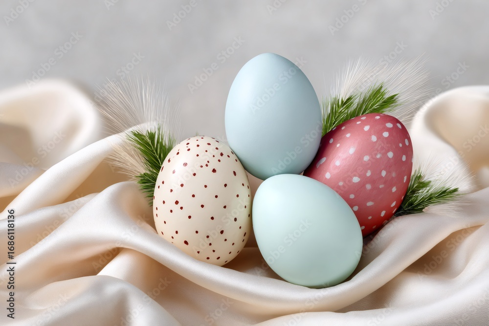 Fototapeta na wymiar - Easter eggs with pastel colors resting on soft beige silk cloth.