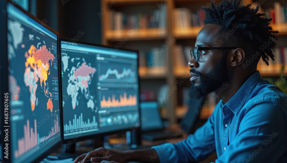 Fototapeta na wymiar - Black demographer analyzes global population data on computer screens displaying digital maps, charts in research center office. Focused professional with afro hairstyle, glasses concentrates on.