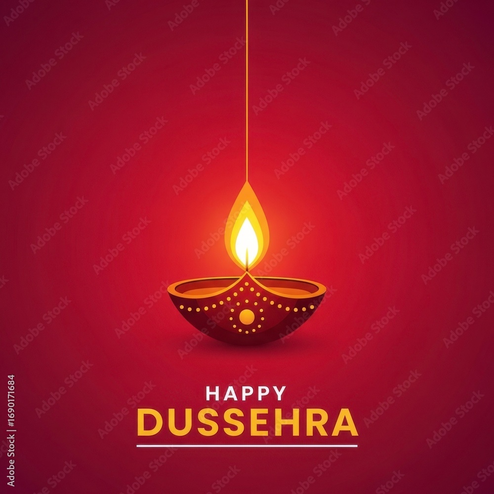Fototapeta na wymiar - A festive dussehra greeting card featuring a lit diya against a red background art.