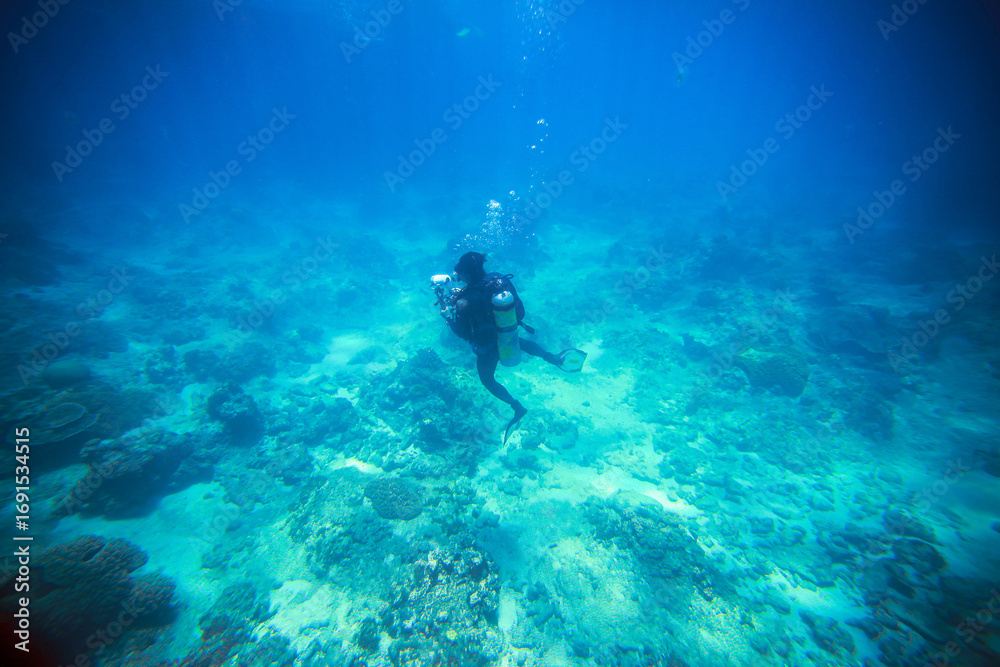 Fototapeta na wymiar - One scuba diver takes pictures underwater world on the Great Barrier Reef. Diver with camera, top view.