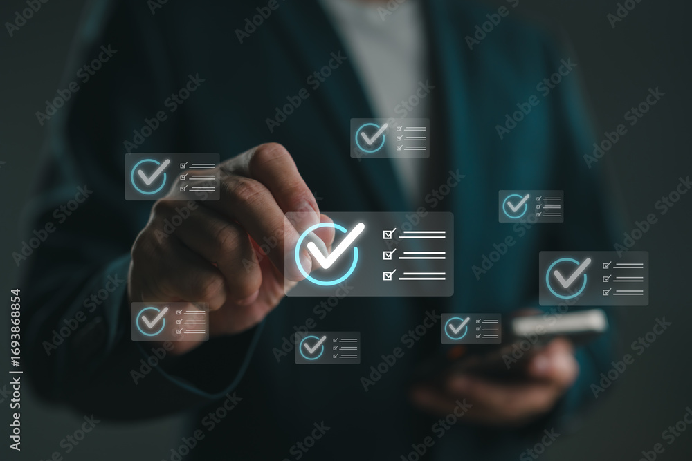 Fototapeta na wymiar - Businessman managing digital checklist with virtual interface on smartphone, representing task completion, productivity, workflow management and goal tracking technology..
