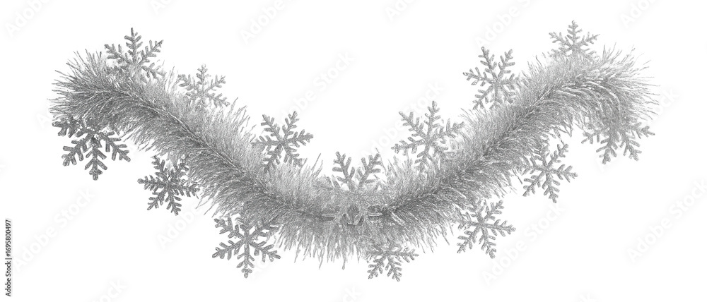 Fototapeta na wymiar - Silver tinsel garland with snowflake-shaped details and sparkling look.