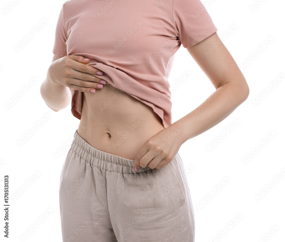 Fototapeta na wymiar - Woman with flat belly on white background, closeup.