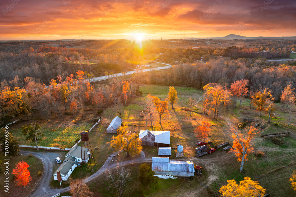 Fototapeta na wymiar - Large traditional homes in forest of autumn colors in Appalachian USA. Yellow and orange trees at sunset in North Carolina countryside..