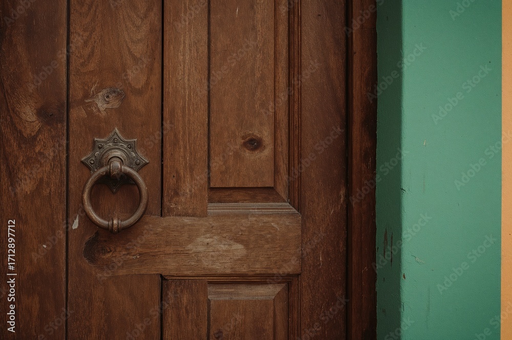 Fototapeta na wymiar - Door made of wood featuring a lock and a knocker.
