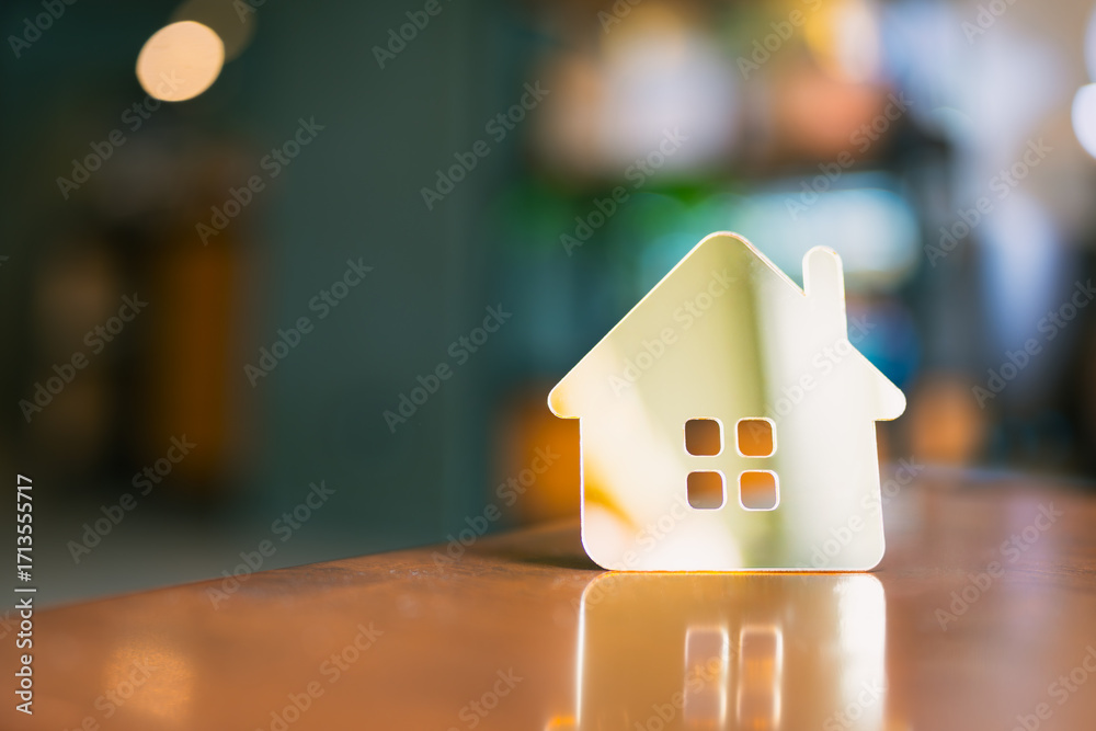 Fototapeta na wymiar - Gold house icon on wooden table with warm blurred background. Concept of home ownership, real estate investment, housing insurance, family security, and property business branding visuals..