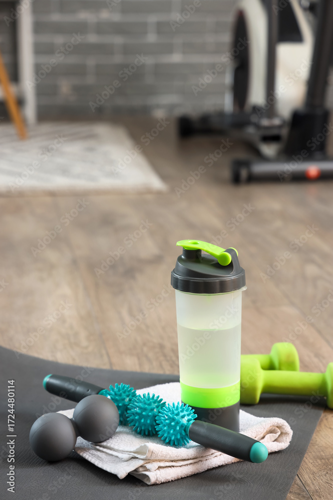 Fototapeta na wymiar - Sports equipment with water bottle on mat in room, closeup.