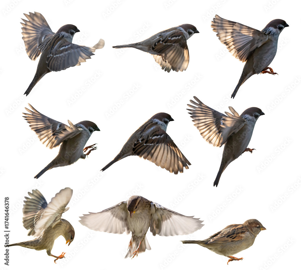 Fototapeta na wymiar - isolated nine Eurasian tree sparrows collection.