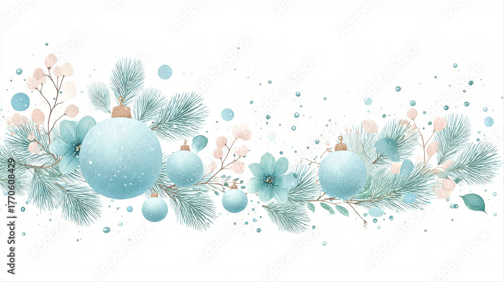 Fototapeta na wymiar - Elegant Pastel Holiday Border with Winter Greenery and Baubles for Christmas Decor. Christmas and New Year Garland.