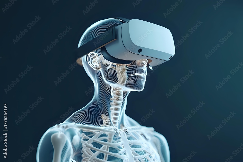 Fototapeta na wymiar - Translucent human skeleton wearing virtual reality headset on dark blue background, representing digital technology and medical visualization..