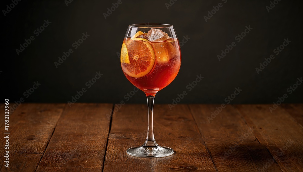 Fototapeta na wymiar - Gin tea tonic presented in a wine glass atop a wooden table, focusing on beverage presentation.
