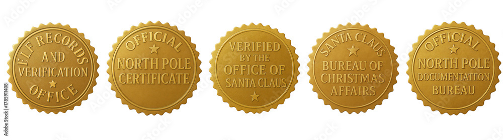 Fototapeta na wymiar - Official North Pole gold seal set — Santa Claus certified Christmas stamps and nice list stickers.
