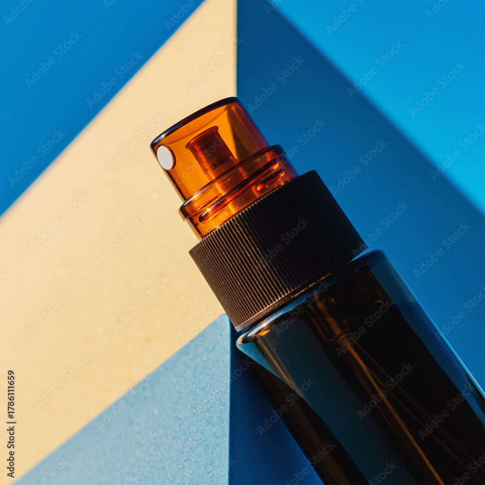 Fototapeta na wymiar - Close-up Amber Spray Bottle Mockup with Geometric Blue and Yellow Contrast.