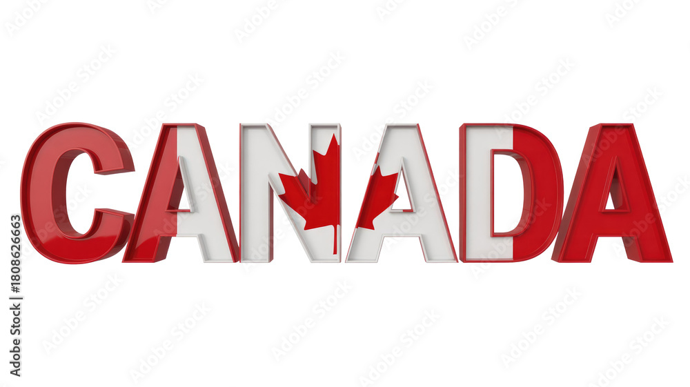 Fototapeta na wymiar - Vibrant 3D rendered "CANADA" text, incorporating the national flag's red and white colors and iconic maple leaf. Isolated on transparent background. background removed.