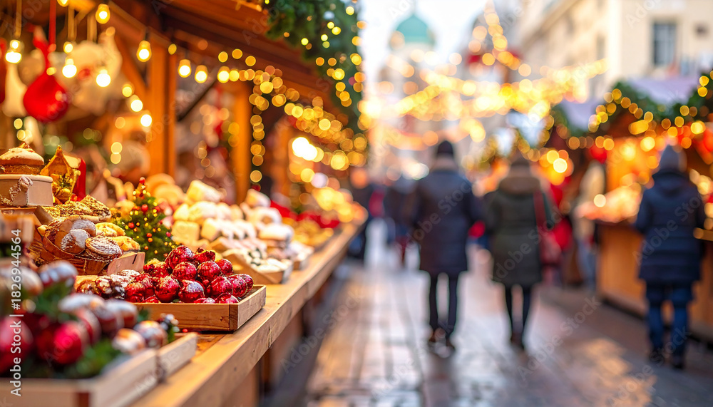 Fototapeta na wymiar - Perspectiva de una calle de mercado o mercadillo navideño con dulces y artículos navideños, iluminado con luces cálidas durante las fiestas y las compras de navidad.