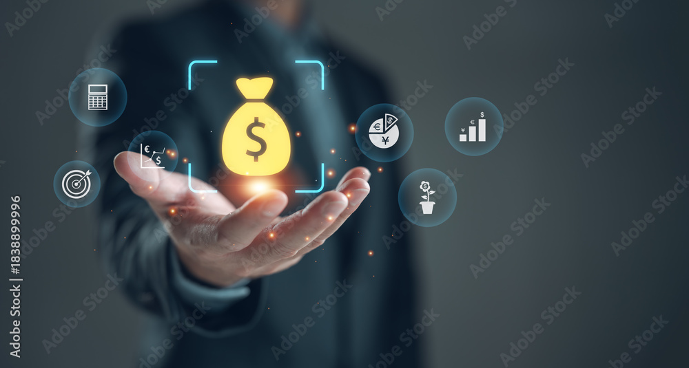 Fototapeta na wymiar - Businessman presenting investment growth and financial management concept. Digital icons of money bag, currency exchange, ROI, and target symbolizing profit strategy and wealth planning..