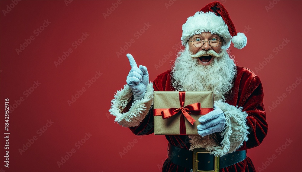 Fototapeta na wymiar - Santa Claus holding a gift in his hand with his other hand pointing to the side at a blank red background.